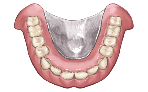 総入れ歯の基本的な構造は、ピンク色のプラスチックでできている本体と人工の歯で構成されていますが、このピンク色のプラスチックの部分を金属に置き換えたものを金属床義歯といいます。すべてを金属にすることではなく、上顎の総入れ歯の場合には、上顎の裏側(口蓋・こうがい)を金属にし、下顎の総入れ歯の場合は舌側を金属にします。